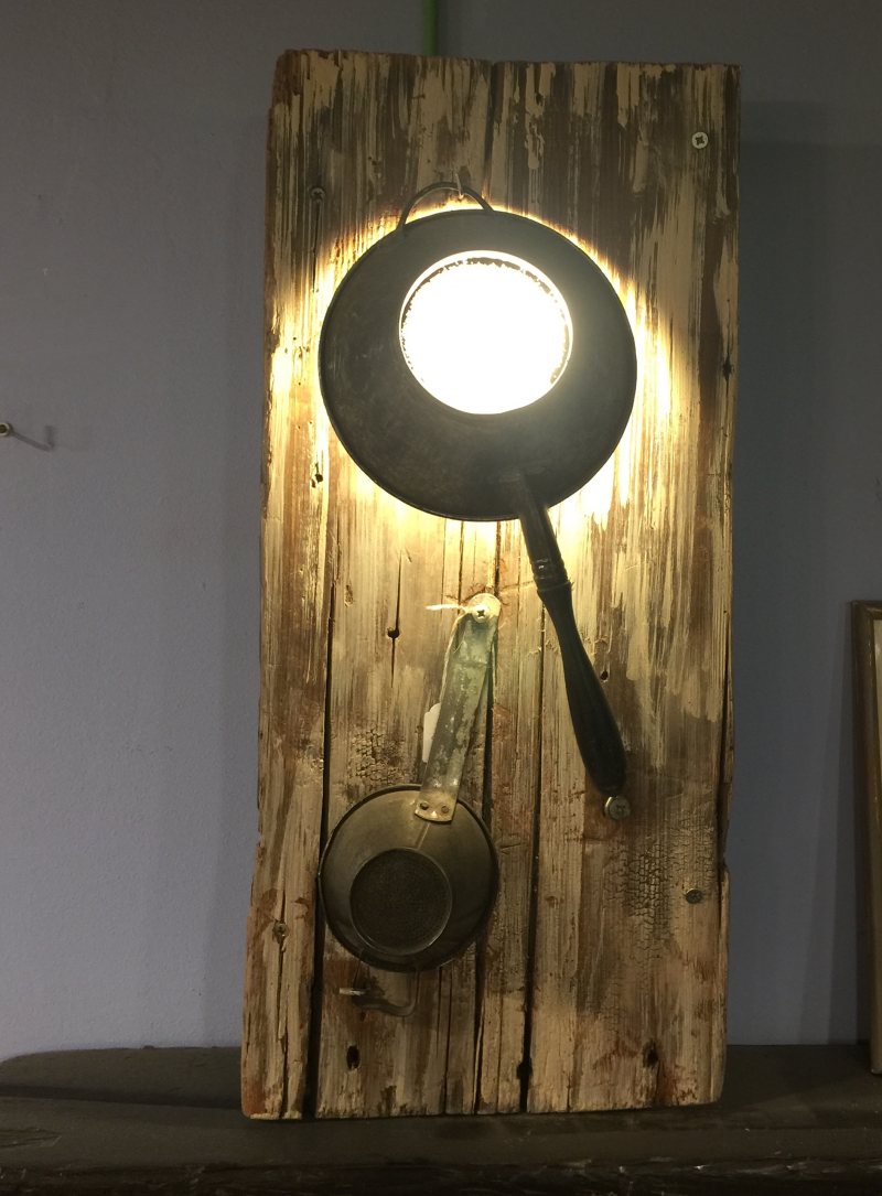 Creación lámpara a partir de madera antigua y viejos coladores